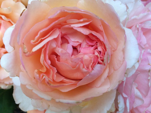 Princess Charlene De Monaco Rose - Vase Life Comp Of 2 Buds Abraham Darby Vs Princess Charlene De Monaco, Across (12 cm), very full, light apricot to shell pink flowers, adorned with elegantly ruffled petal edges.